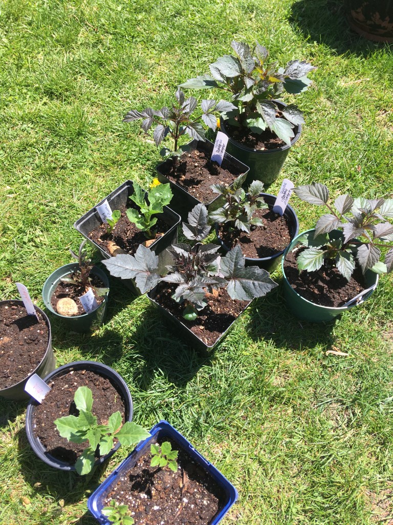 Potted dahlia tubers $12 – all are single flower types – I grow these because the bees love them!