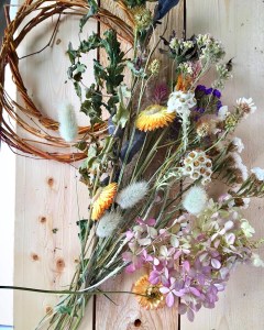 Rosalind’s Garden Blooms works with nature and helps you make your own dried flower wreaths from one of her kits that contain all you need (flowers, 2 vine bases, raffia, compostable twine and recycled wool, linen or silk for ribbon). These will be available for ordering soon.