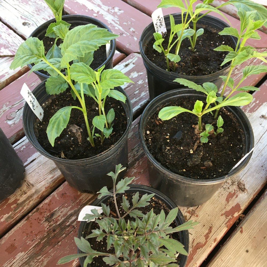 Potted and sprouted dahlia tubers are $15