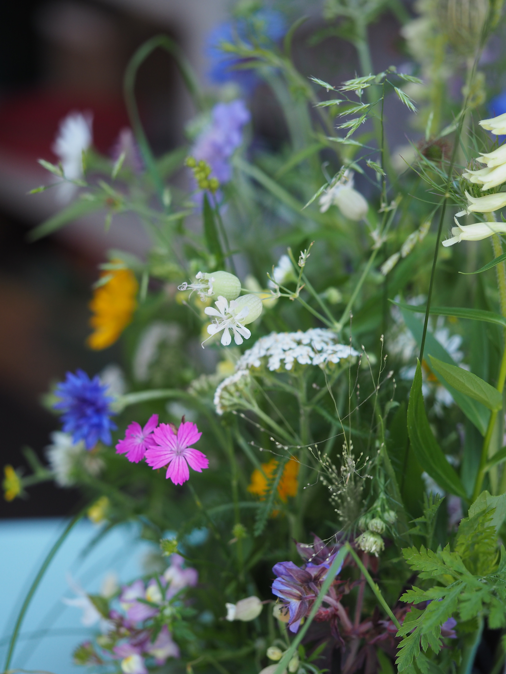 Around this time of year all of the things I think of as meadow flowers start to bloom. For me that includes cornflowers, ox eye daisies, scabious, buttercups, yarrow and, of course, wild grasses. I always make myself an arrangement that reminds me of those long summer days spent picnicking in beautiful meadows, watching the clouds sail by and listening to the insects hum.