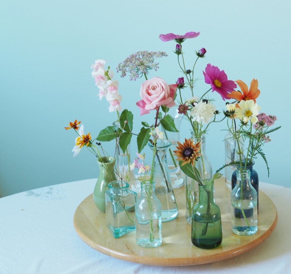 I did manage to pick the last few stems of flowers and had fun displaying them as a group in bud vases. This rose was an added bonus as it is beautifully scented.