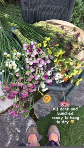 I really love working with my dried flowers and have been busy all summer harvesting and hanging the flowers to dry. Slowly they get sorted and brought in to my work area for me to start using in bouquets, wreaths and more.