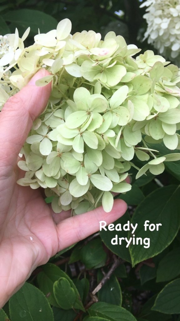 The first step is to pick the hydrangea flowers at the correct stage. You need to wait until the flower heads start to change from white to slightly coloured. I only have Hydrangea paniculata ‘Limelight’ in my garden so it is those I am mainly talking about although these methods do apply to other types.