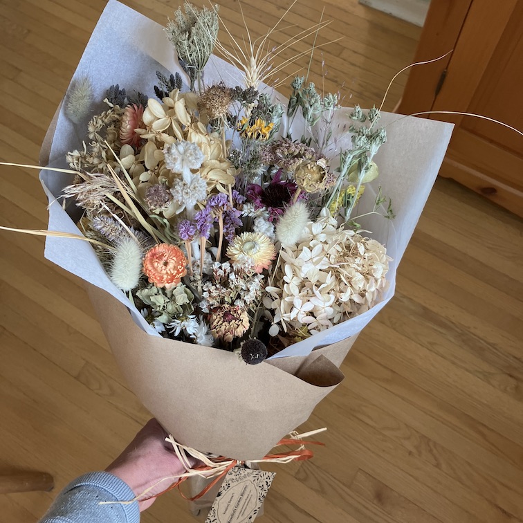 I also use broken heads stuffed in containers or vases as a base for dried arrangements and loose petals in dried flower confetti. Nothing goes to waste and any unusable broken heads go to Zoe’s Corner where she uses them as part of her eco friendly packaging!
