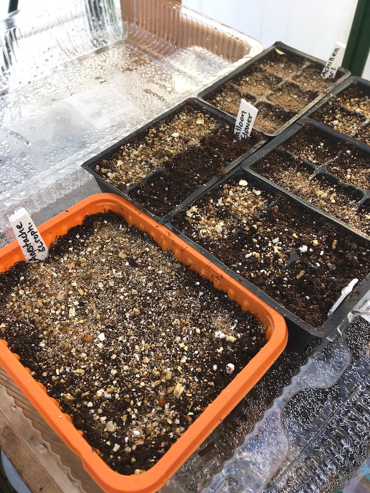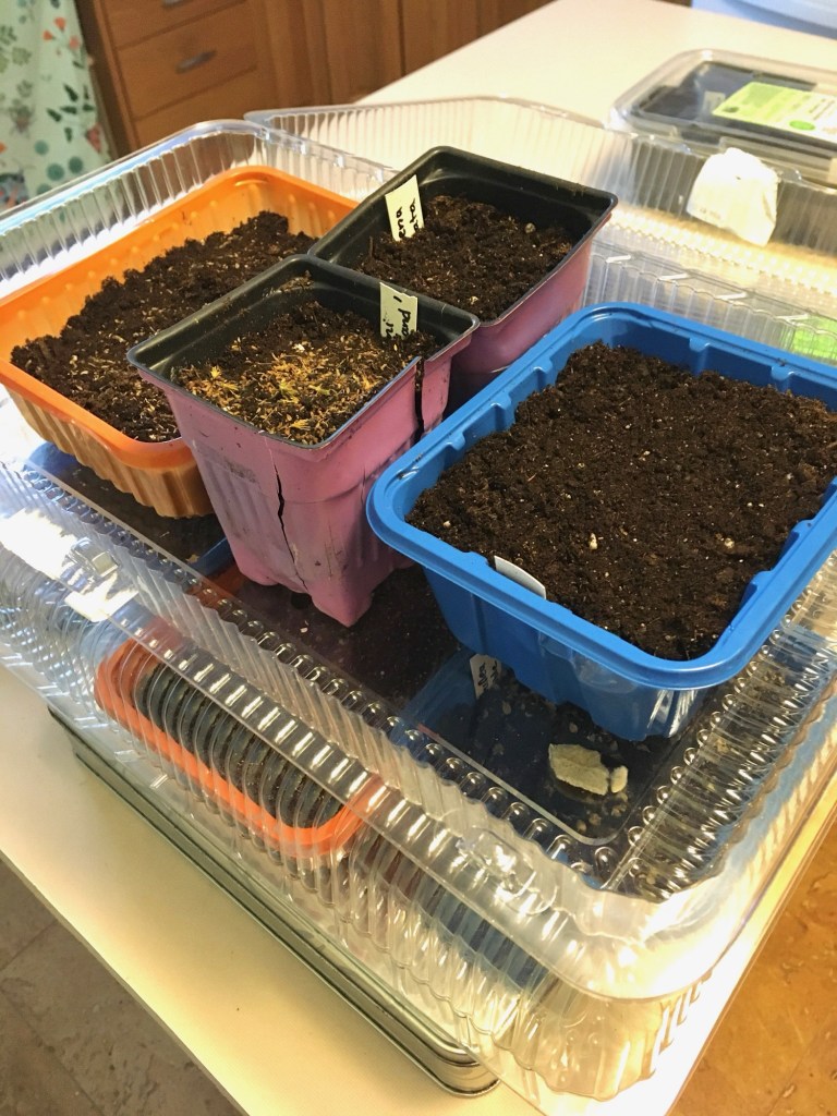 It is a way to germinate seeds outdoors in mini greenhouses made from recycled containers and bottles. This mimics nature in a slightly controlled environment and works well for many of our cold climate native plants that we have in the past had to ‘cold stratify’ (provide a period of cold moist conditions, usually in the fridge, to break dormancy and to get to germinate)