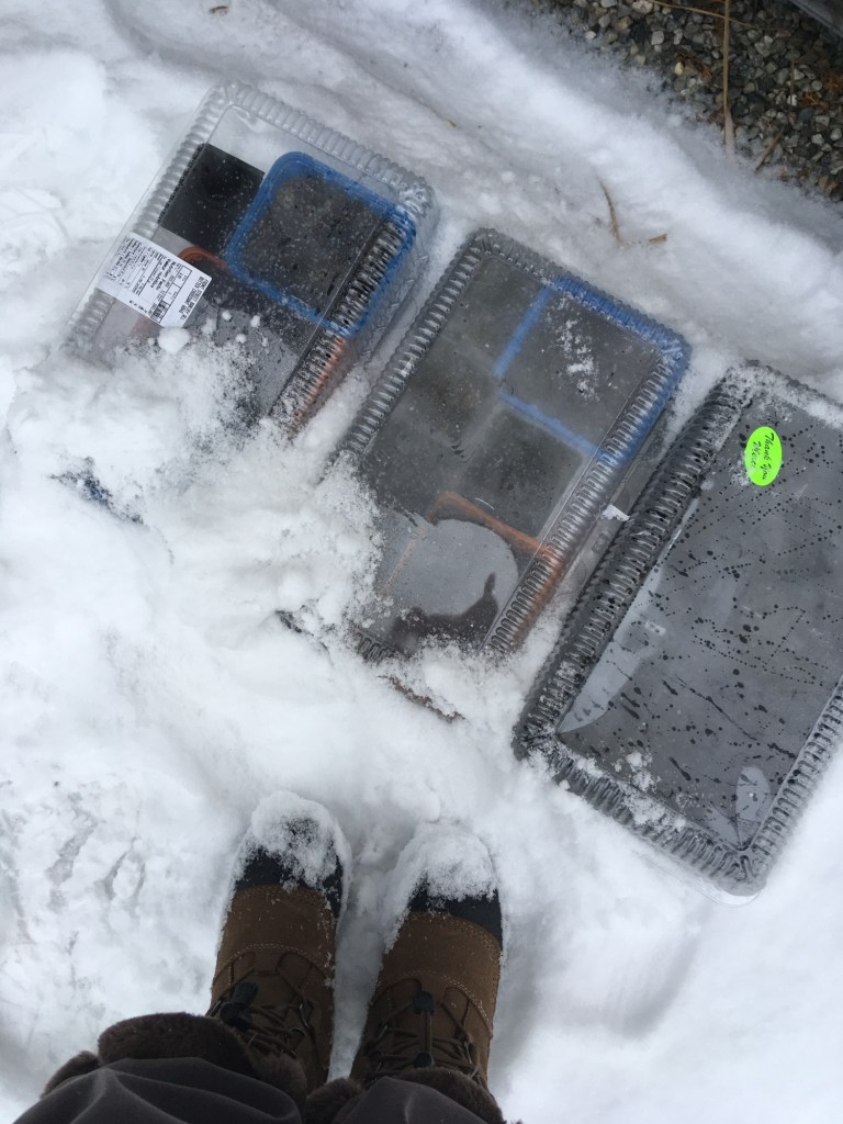 I sow and label the seeds as I would for normal sowing then pack them into the clear containers closing the lids. Make sure your sowing medium is moist but not soaking. I then find a suitable place outside in the snow to leave them all winter. A north or east facing wall works well and after covering with snow I put my large compost sieve on top just so they don’t get crushed under the snow or accidentally walked on.