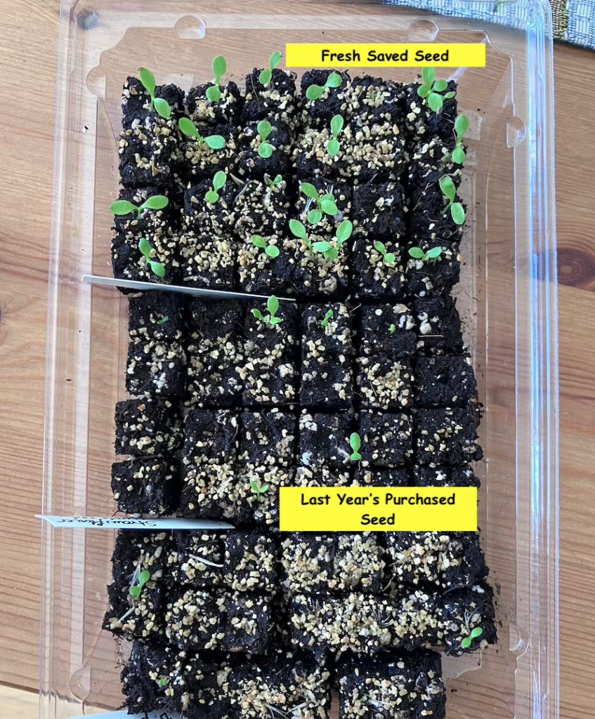 Always choose the freshest seed possible. You can see the difference here between fresh saved seed and reusing leftover seed from the previous year.